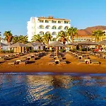На пляже отеля есть кресла для отдыха и зонтики.